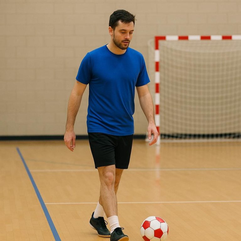 Gåfotboll under avslappnande former med en enväldig domare där det Blå laget möter det Röda laget i en match om